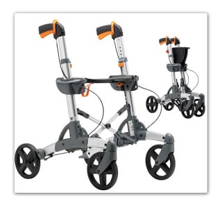 Andador tipo rollator de diseño ergonómico y moderno con 4 ruedas macizas y frenos accionables en las manecillas.