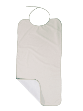 Babero para adulto reutilizable, con rizo. Fabricado 100% en algodón + PU sanitario. Se utiliza para proteger de manchas durante los cuidados y comidas. Aporta confort, absorción e higine. Fácil utilización con tiras para atar.