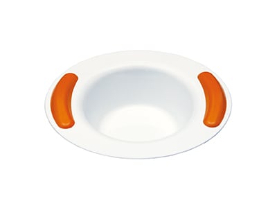 Bol de melamina de 330ml de capacidad, con aspecto similar a la porcelana pero mucho más resistente. Dispone de coloridos mangos antideslizantes.