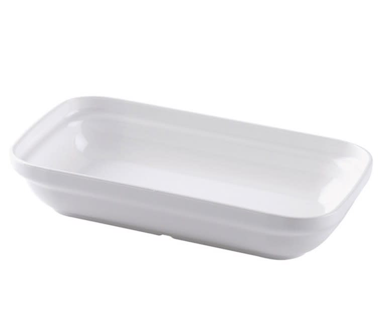 Fuente de policarbonato rectangular de 18cm. Apilable, desprovista de nervios interiores para facilitar su limpieza. Cuenta con sistema antiencaje para evitar que hagan vacío una con otra.