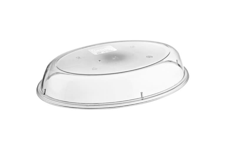 Tapa oval para plato oval en policarbonato. Dotada de un orificio en la parte superior para evitar la condensación con contenidos calientes y que hagan vacío. Irrompible en condiciones normales de uso.
